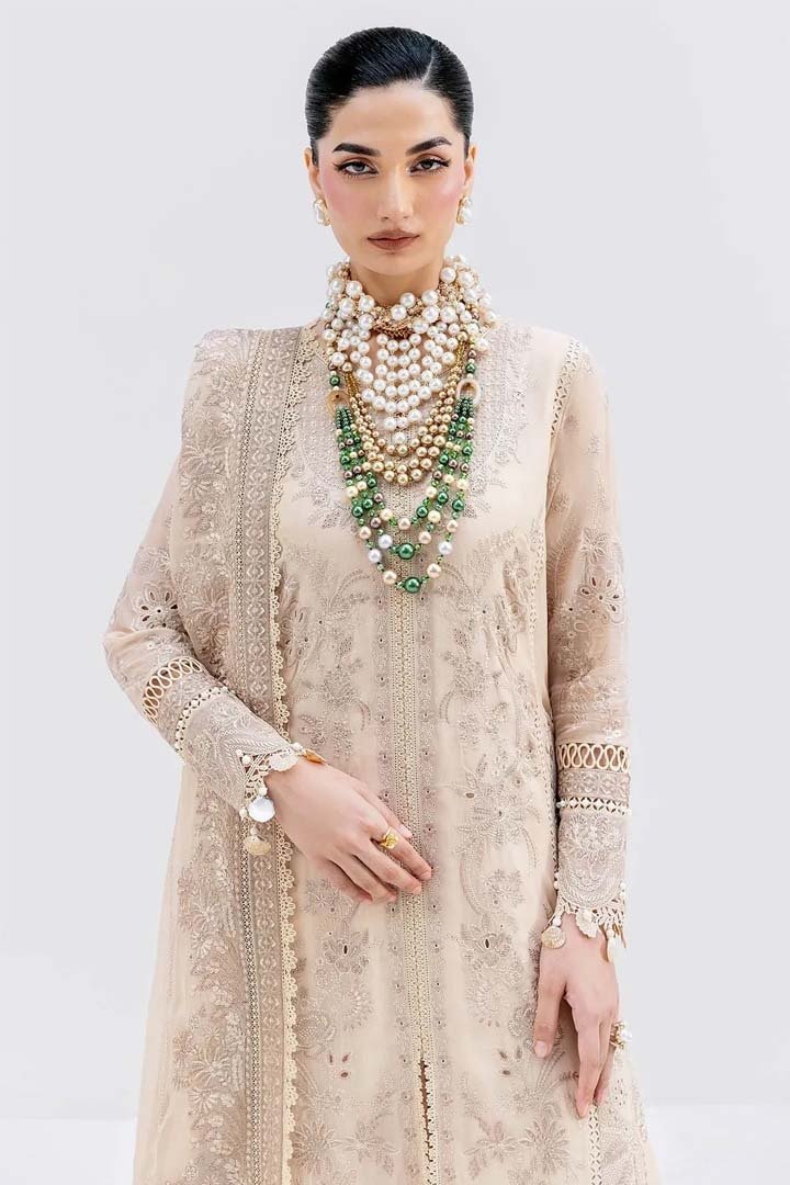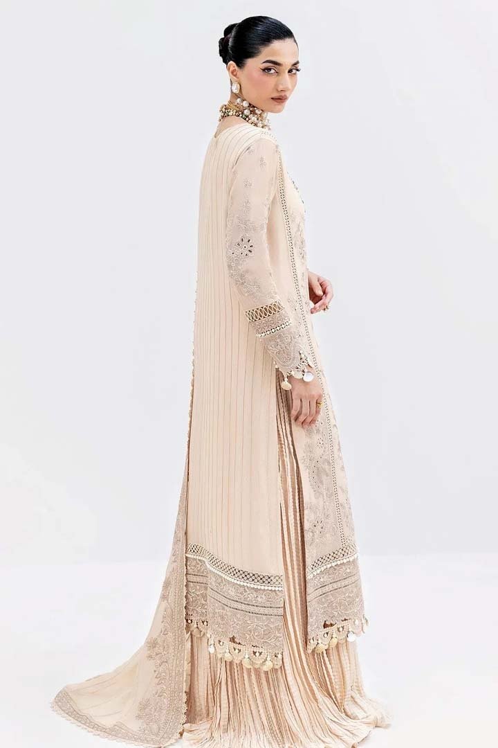 Delicate Drama in Formal Silhouettes S-1094 offers an elegant blend of softness and structure. The georgette shirt features refined embroidery and organza borders that add depth and luxury. A beautifully embroidered dupatta completes the look, balanced with plain raw silk trousers. Occasion: Suitable for festive gatherings, formal dinners and special occasions.