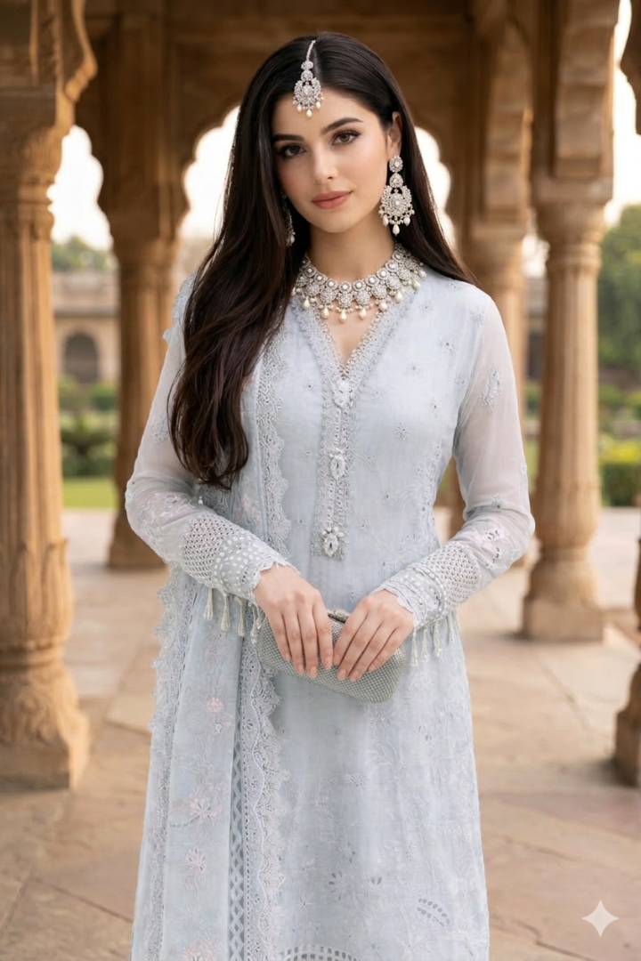 Soft, romantic, and delicately opulent, Sultana Zehra is a refined blend of luminous pearls and pastel mint accents.