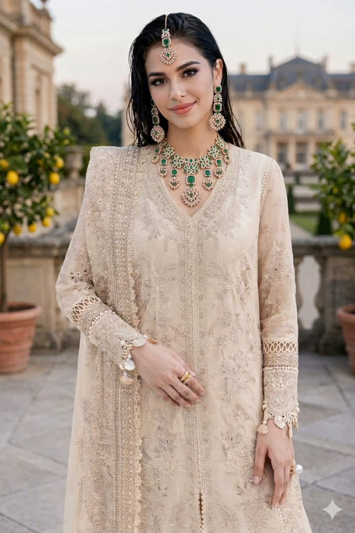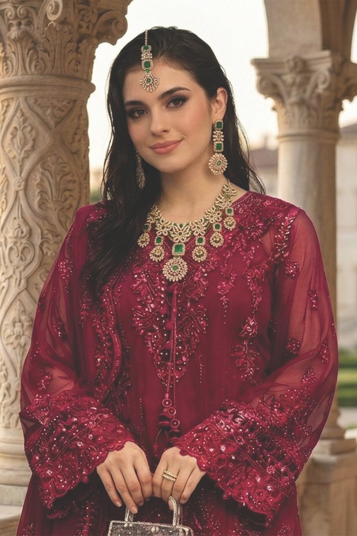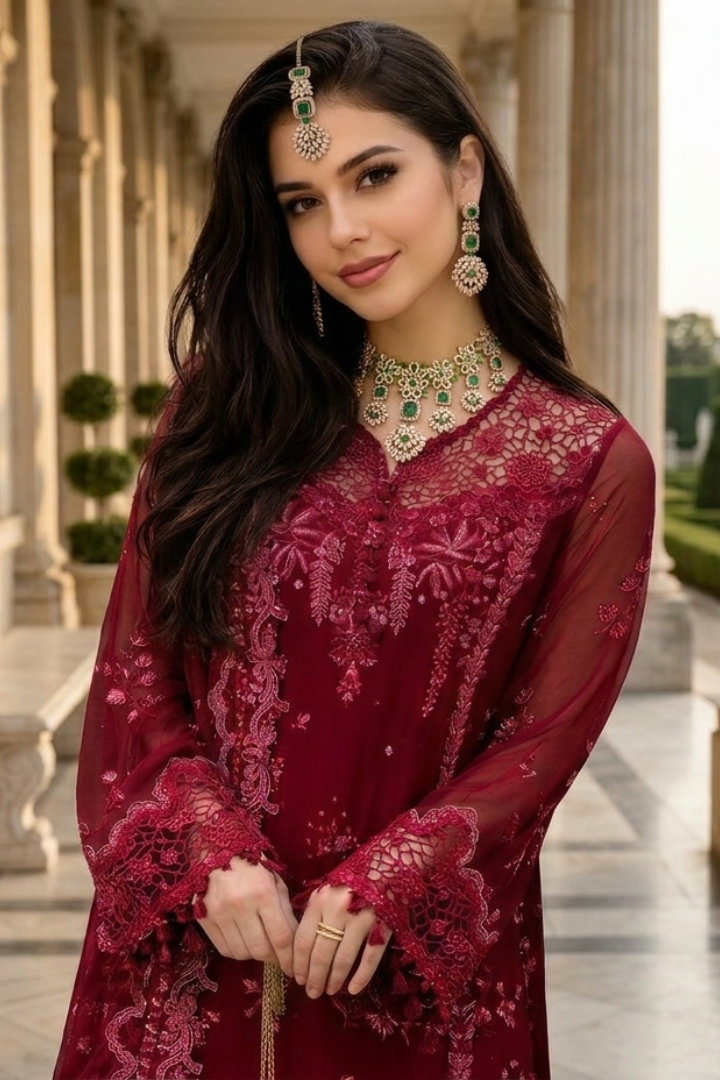 Fresh yet regal, Zümrüt Bahar blends floral inspiration with architectural symmetry. The vibrant emerald-toned stones are framed within delicate leaf-shaped motifs, forming a graceful botanical pattern along the neckline. Dangling clustered accents add dimension and movement, enhancing the luxurious presence of the design. The matching earrings and headpiece maintain the same geometric elegance, creating a balanced yet striking look. This set pairs exquisitely with deep green, gold, cream, or even contrasting maroon outfits, making it ideal for engagement ceremonies, mehndi events, or formal receptions.